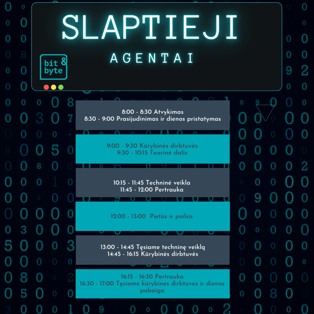 Vaikai taps informacijos detektyvais ir aiškinsis, kaip internete keliauja duomenys, kas juos renka ir kaip algoritmai veikia mūsų pasirinkimus. Kūrybinėje dalyje kurs savo slaptų agentų bazę – su kodiniais vardais, simboliais ir paslaptingais signalais, kurie lydės visą stovyklą.